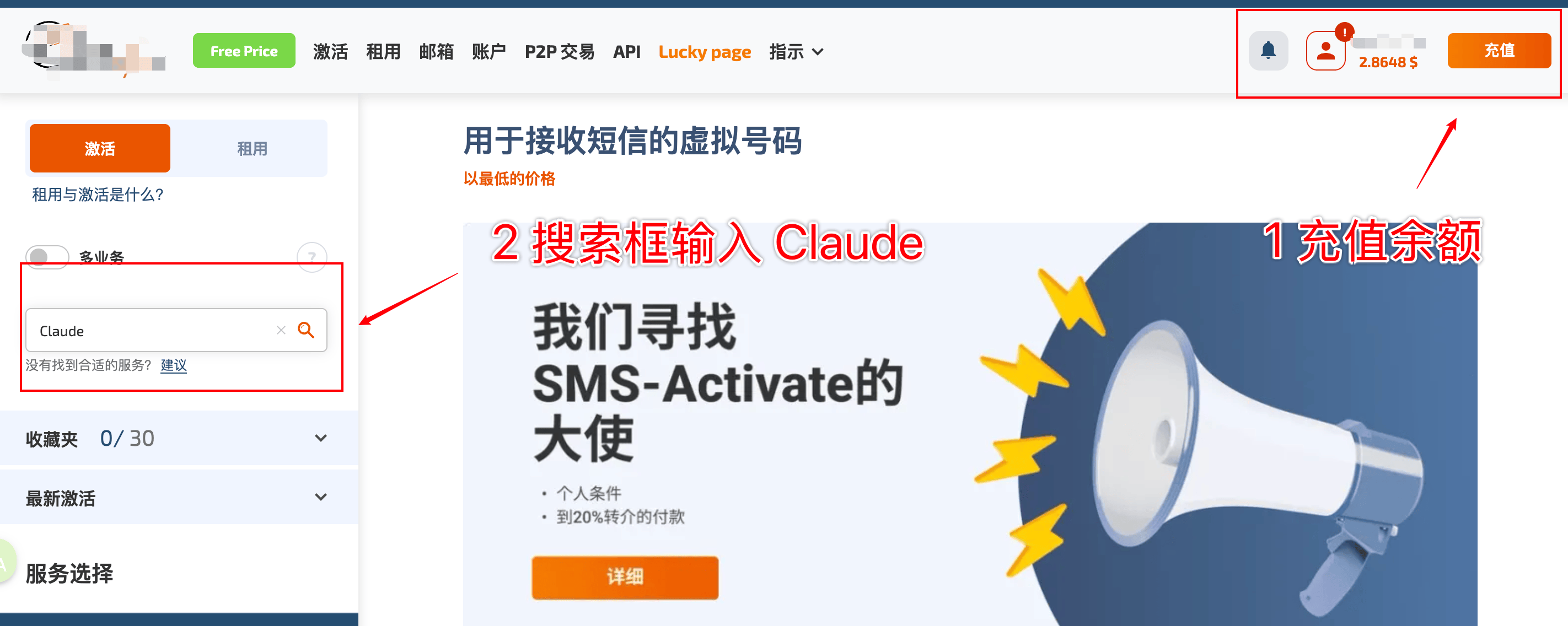 1. 打开页面后点击充值,支付方式支持微信/支付宝,一个电话号0.4美金,最少充值 2 美金。充值完成后在搜索框搜索 Claude