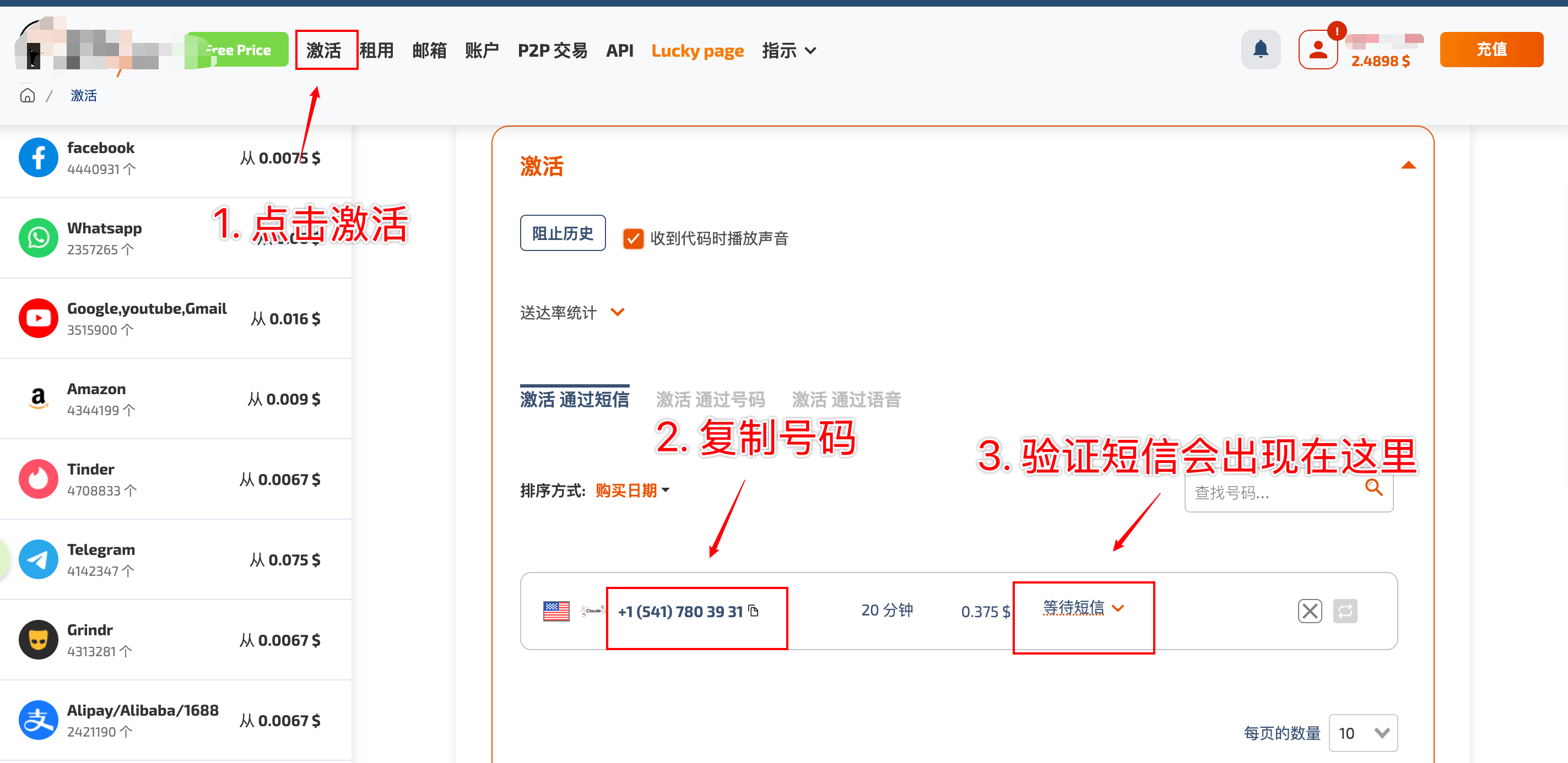 2. 一个接码平台,推荐:https://sms-activate.io/cn